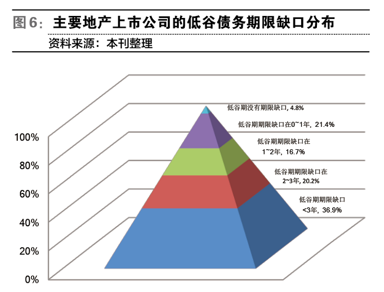 此外,由于国内地产企业普遍缺乏长期融资渠道,所以,在行业低谷中有95%的企业都将面临资金来源无法覆盖项目投资回收周期的期限结构缺口问题,平均的期限缺口达到28个月,近六成的企业面临两年以上的期限缺口。