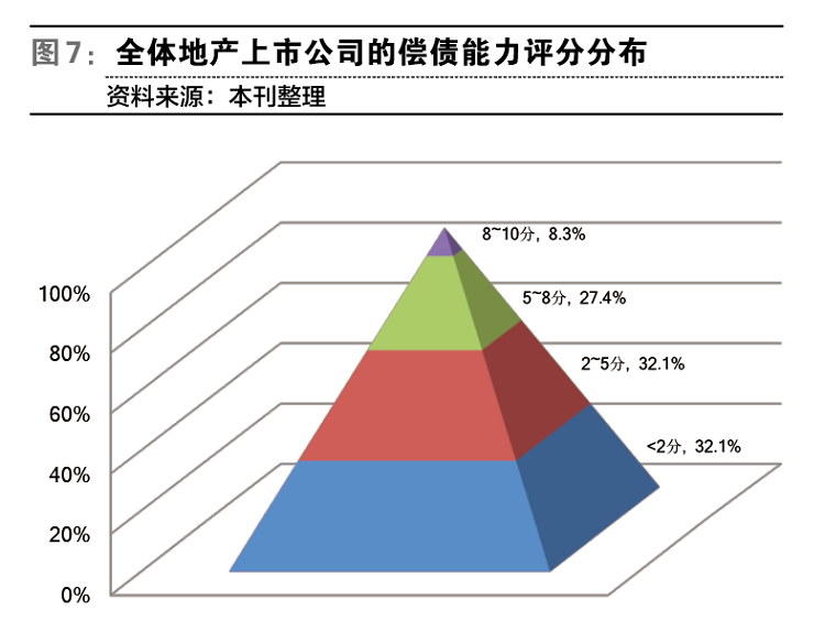 结果,84家主要地产上市公司2020年中期偿债能力评分的均值为3.85分,中位数为3.50分。其中,有7家公司评分在8分以上,占总数的8.3%;有23家公司评分在5-8分之间,占总数的27.4%;有28家公司评分在2-5分之间,占总数的31.0%;还有28家公司评分小于2分,占总数的33.3%。