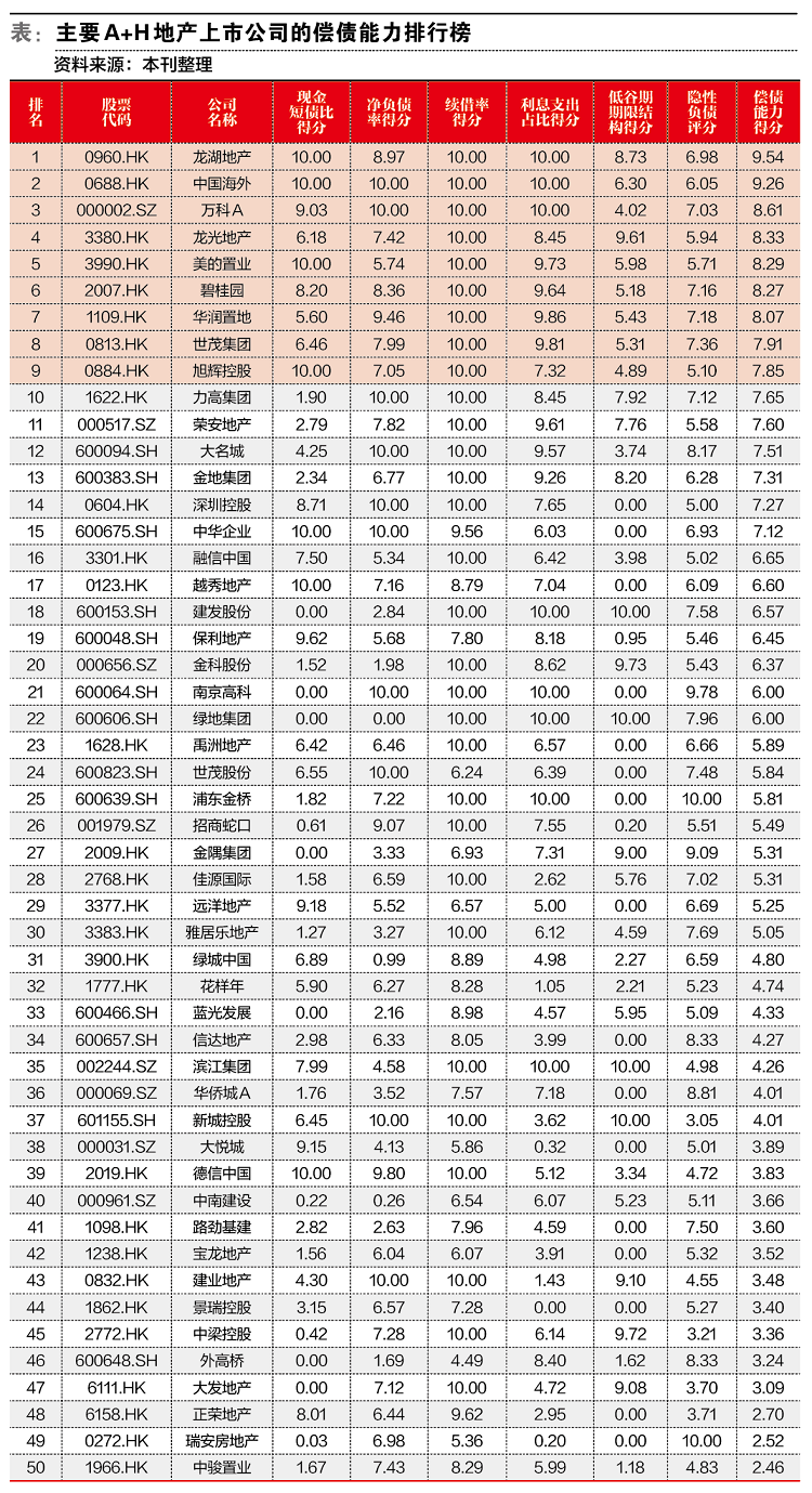 综合考虑表内偿债能力及表外负债预警,龙湖地产(0960.HK)、中国海外(0688.HK)、万科A(000002.SZ)、龙光地产(3380.HK)、美的置业(3990.HK)、碧桂园(2007.HK)、华润置地(1109.HK)、J9在线平台(0813.HK)、旭辉控股(0884.HK)、力高集团(1622.HK)进入了我们的偿债能力排行榜TOP 10。