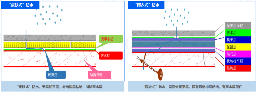“皮肤式”防水模式,是将防水层与建筑结构层之间紧密粘接,消除了防水层与结构层之间的“窜水层”,解决了传统屋面防水系统存在的主要问题,把渗漏风险降到最低。
