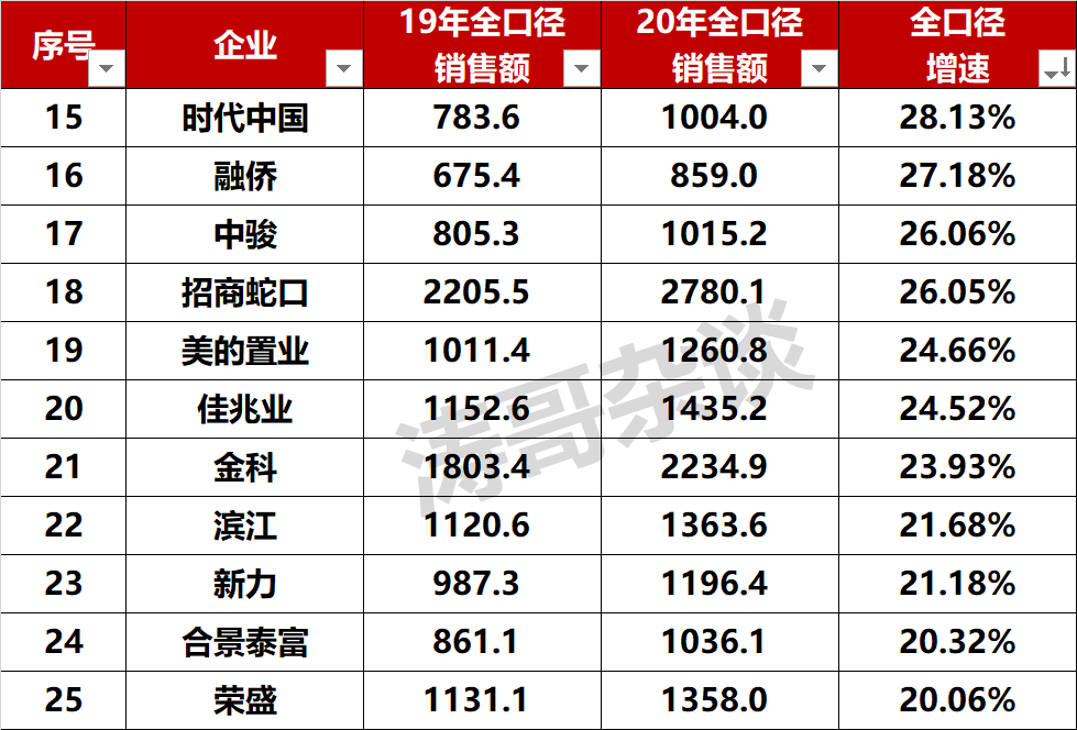 涛哥复盘了2020年TOP50增速发现,50强房企全口径业绩增速为16%,其中25家房企增速超20%。