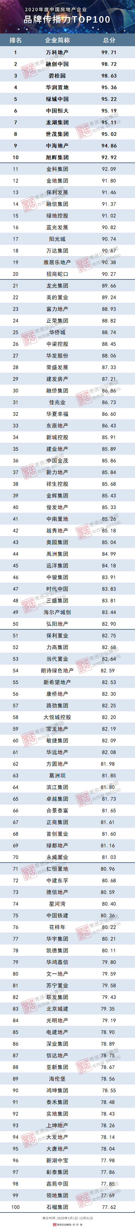 本榜单由克而瑞研究中心独家发布,测评研究对象为所有房地产开发企业。通过发布房企“品牌传播力”榜单,我们能够科学地评价和度量不同规模的房企品牌形象塑造、宣传推广策略、公共关系维护等能力,以及运营带来的品牌传播力,帮助房企找准合适的品牌定位和发展方向 。