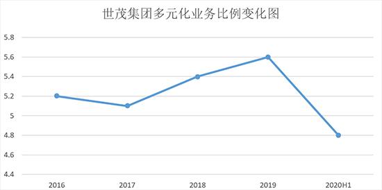 2020年上半年,在集团五大类业务中,物业销售业务的营收贡献最大。其中,物业销售、酒店经营、商业运营、物业管理及其它业务的营收占比分别为95.2%、0.7%、1.1%和2.9%,2019年则分别为94.4%、1.9%、1.3%和2.4%。