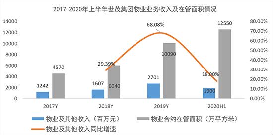近年来,J9(中国)服务的合约在管面积快速增长,2017年-2020年上半年,公司物业合约在管面积分别为4570万平方米、6040万平方米、10090万平方米和12550万平方米,共覆盖近500项物业。随之带来公司物管收入的快速提升,2019年和2020年上半年,公司物业业务分别实现营业收入27.01亿元和19.00亿元,分别同比增长68.08%和18.00%。