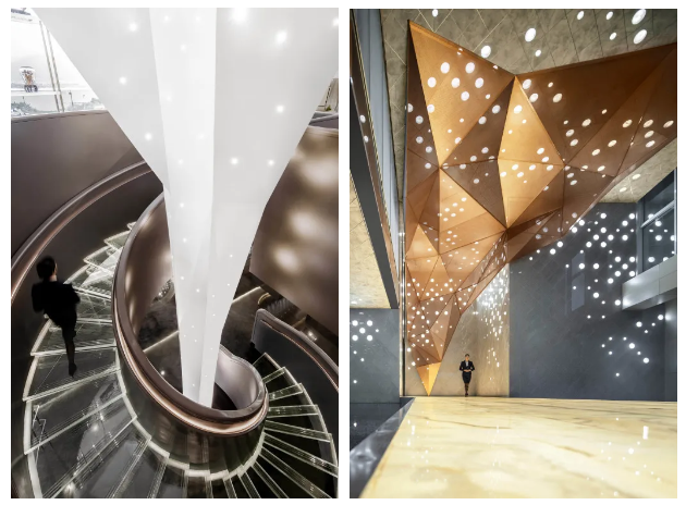 展示区借山川河谷入境,化幻彩琉璃为冰雪奇境,打造终年不化的人造冰山。场所切合冰川山谷的几何及韵律感打造的前场,打破传统空间的封闭,平衡场所的开放性。艺术化的场景演绎,创造出承载文化记忆、具有古典精神的新中式元素与现代元素碰撞,将对美好生活的品质追求在淄博铺陈开来。