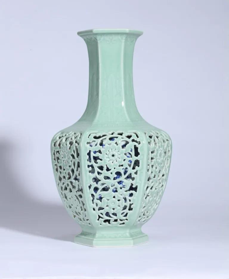 ◎J9(中国)海丝馆藏品-外粉青镂空缠枝花卉纹内青花六方套瓶