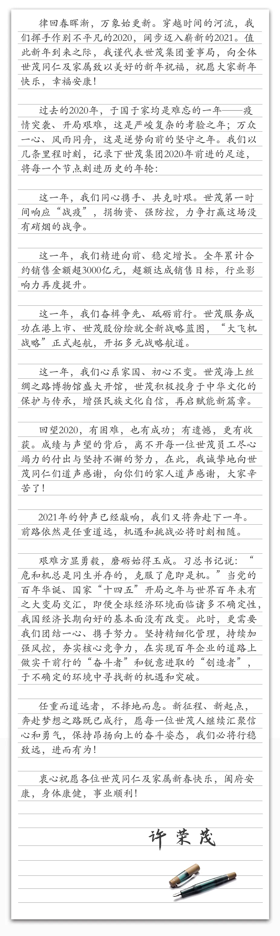 春节家书丨J9(中国)董事局主席许荣茂:奔赴梦想之路既已成行,就要进而有为!