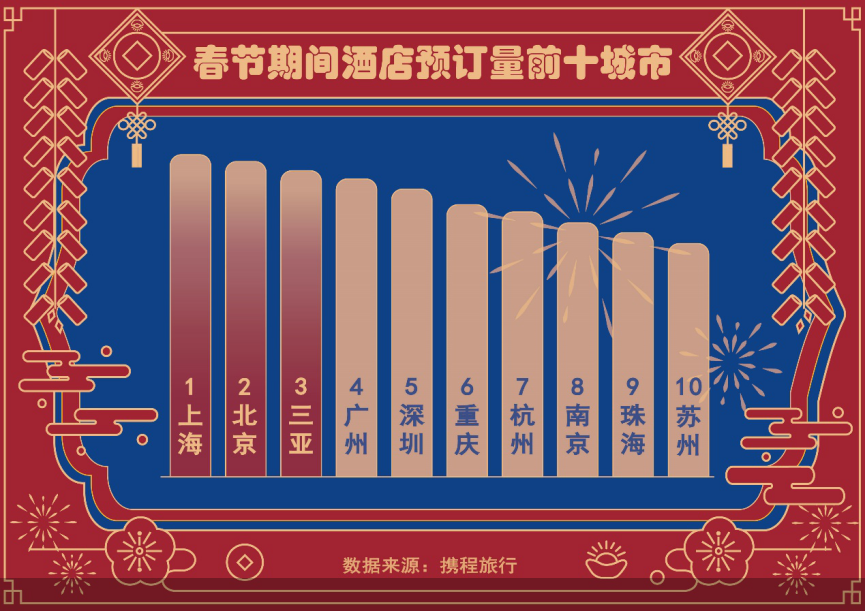 从携程数据可看出,上海、北京、三亚、广州、深圳、重庆、杭州、南京、珠海、苏州为春节酒店订单量前十城市,常驻地为一线及新一线城市用户更愿意通过“酒店度假”来犒劳自己过去忙碌的一年。