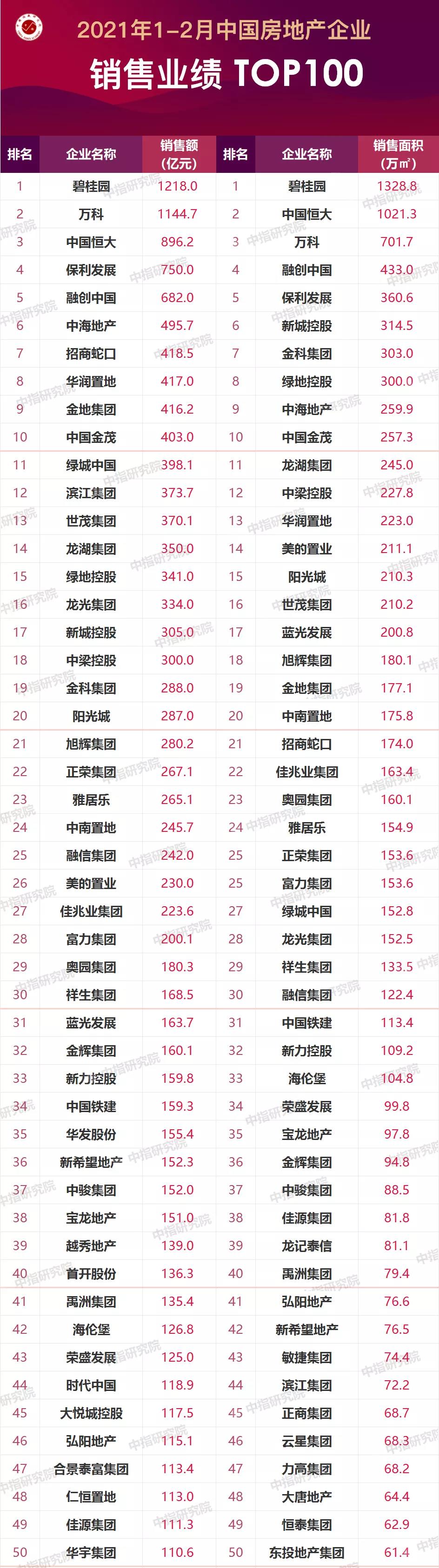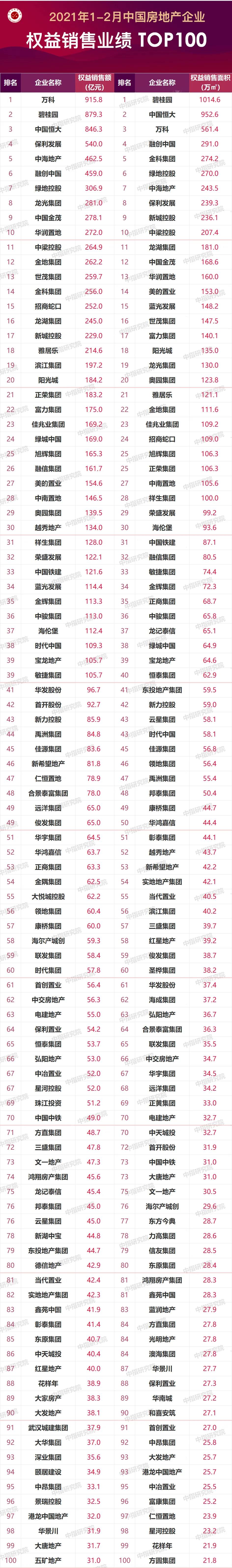 特别声明:房地产企业权益销售数据统计是以2021年1月1日-2月28日期间按股权比例销售的商品房为统计口径,主要依据CREIS中指数据在各地的销售监测数据,并参考当期总体经营情况和推盘去化情况进行分析统计;对于少数没有在监测范围内的城市或项目,由企业提供相关证明文件,经课题组对数据进行严格审核,也纳入统计范围。本报告仅供参考,课题组不对使用报告及其内容所引发的任何直接或间接损失承担责任。