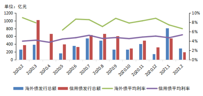 图:2020年-2021年2月房地产行业海外债、信用债发行情况
