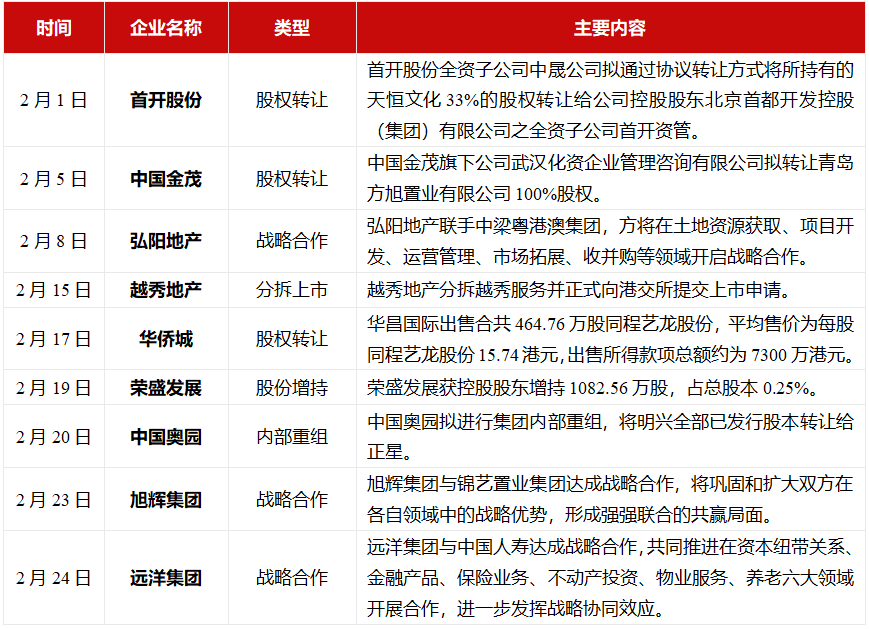 随着“三道红线”以及银行版“两道红线”的影响逐步深入,2021年2月房企密集展开各类型合作。一方面,房企开展内部股权转让工作,加速回笼资金,优化公司内部结构。如首开股份全资子公司中晟公司拟通过协议转让方式将所持有的天恒文化33%的股权转让给公司控股股东北京首都开发控股(集团)有限公司之全资子公司首开资管。另一方面,大型央企间达成重大战略合作,巩固和扩大双方在各自领域中的战略优势,形成强强联合的共赢局面。如远洋集团与中国人寿达成战略合作,共同推进在资本纽带关系、金融产品、保险业务、不动产投资、物业服务、养老六大领域开展合作,进一步发挥战略协同效应。
