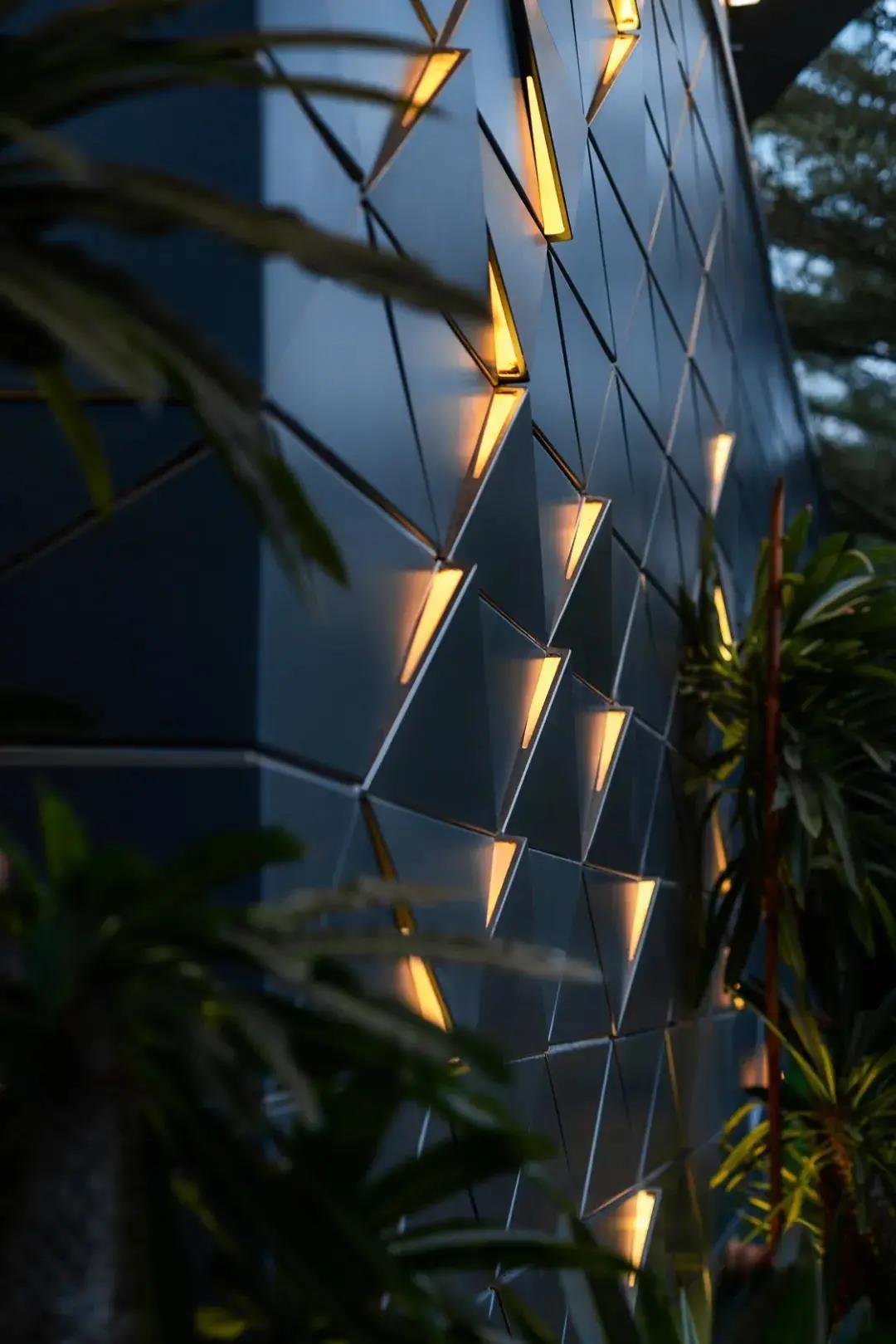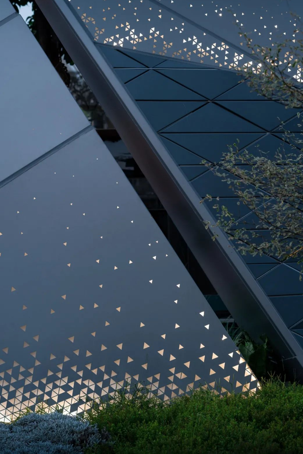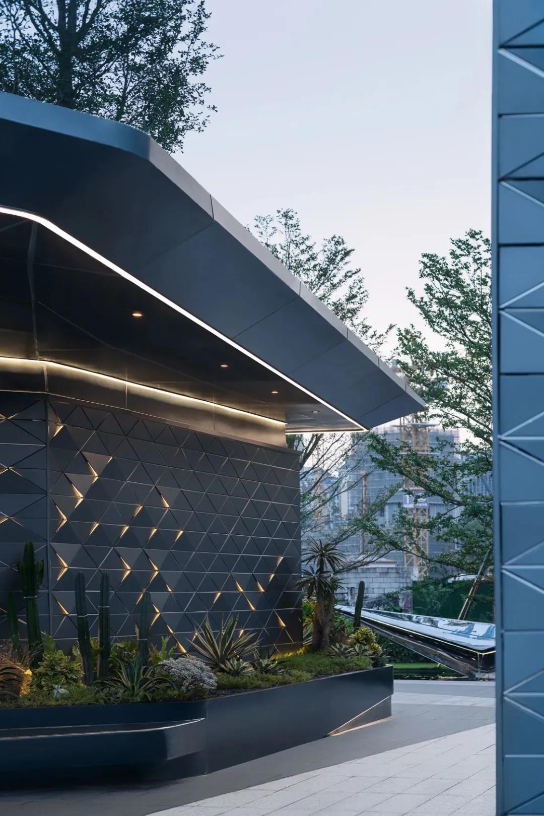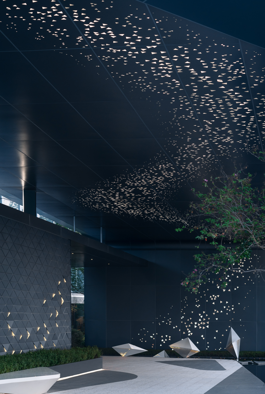 流光星廊景墙设计为了追求流动的视觉体验,严格把控细节,将阳极氧化铝异形景墙起翘角度控制精确至22mm,深色阳极氧化铝金属板与镂空灯光搭配,形成点、线、面的互动,以求达到视觉上最为舒适的效果。