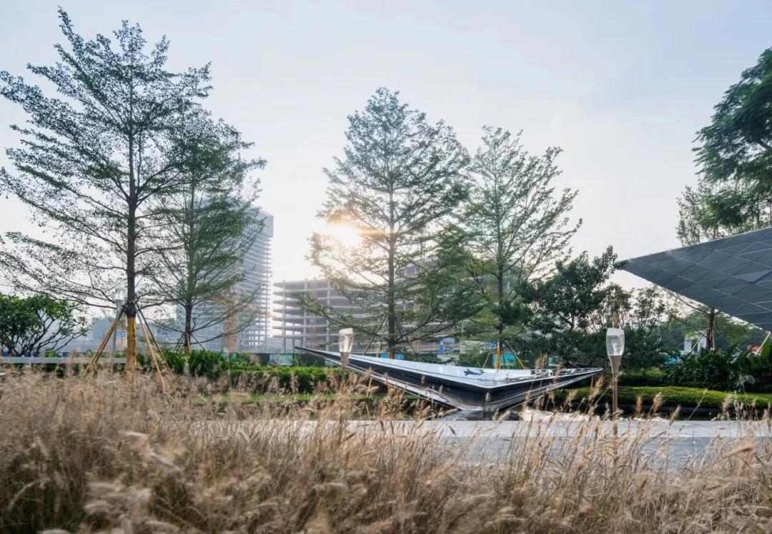 考虑广州多雨的气候,在落客区设置廊下灰空间,在景墙立面的细节上结合灯光做了一些起翘,赋予空间动态流动的视觉体验。雨篷在水平和竖向上都存在着不同角度的渐变,通过不断地建模与反推,最终实现建筑与景观廊架的交接。