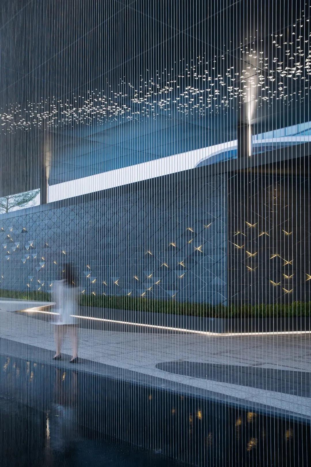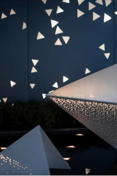 一条由三角形灯光构成的璀璨的“流光星廊”,打造出更具品质感的场景体验。三角形元素在空间中不断变化:从入口蔓延到墙面、流动到水中、又扩散到地面、天花,最终汇聚成一个个璀璨、立体的雕塑。