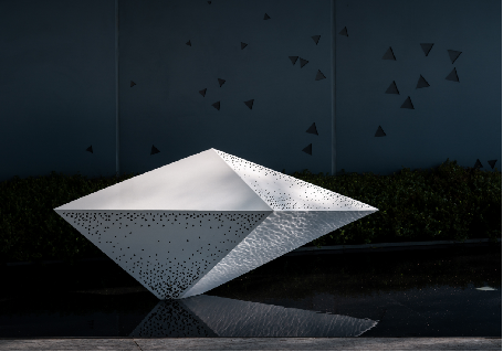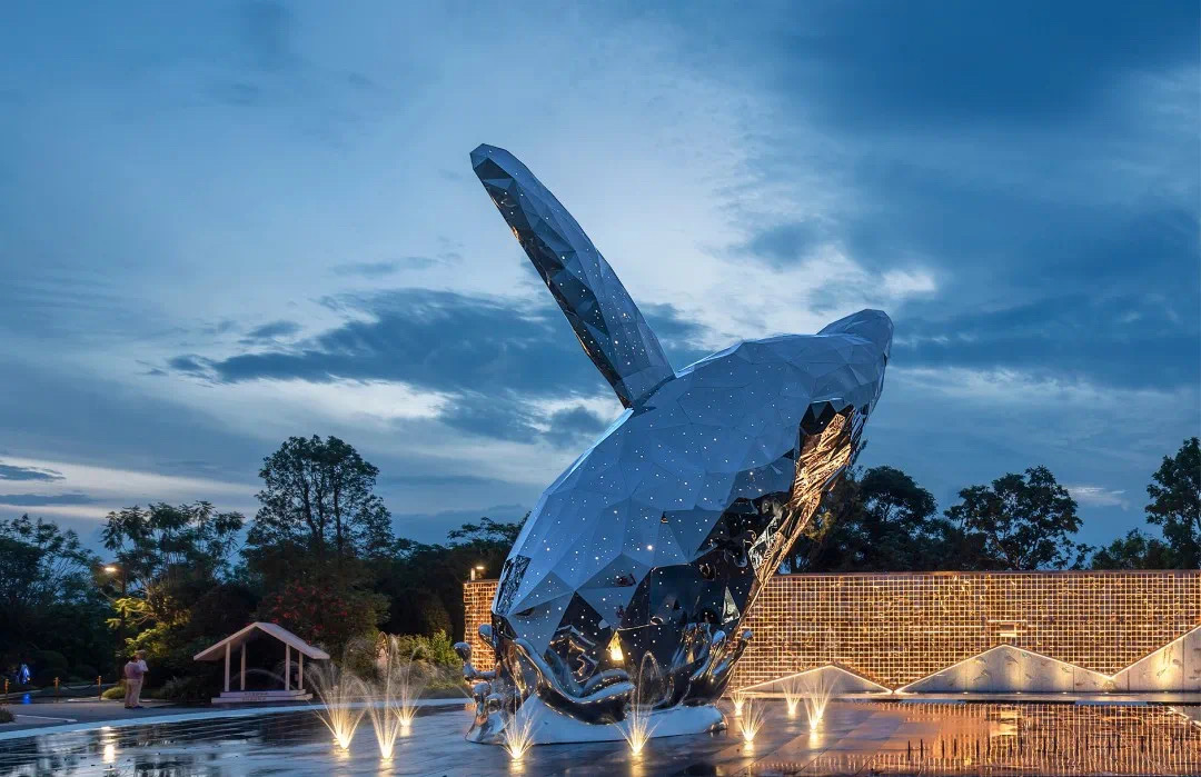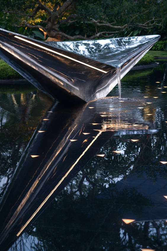 水景雕塑经过多次泥胚打样,以镜面不锈钢材质呈现,水面与灯光相互作用相互成就。