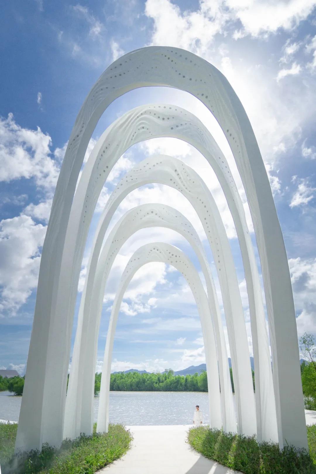 新月码头3D打印的大型装置“海天一色亭”,由5个高度递进的连续双曲面拱门组成,整体有如翻涌而来的层层海浪;表面结合海浪的元素变换花纹,采用腐蚀性的PU底漆工艺,使其加强装置的韧性和耐久性,营造梦幻神秘的自然盛景。