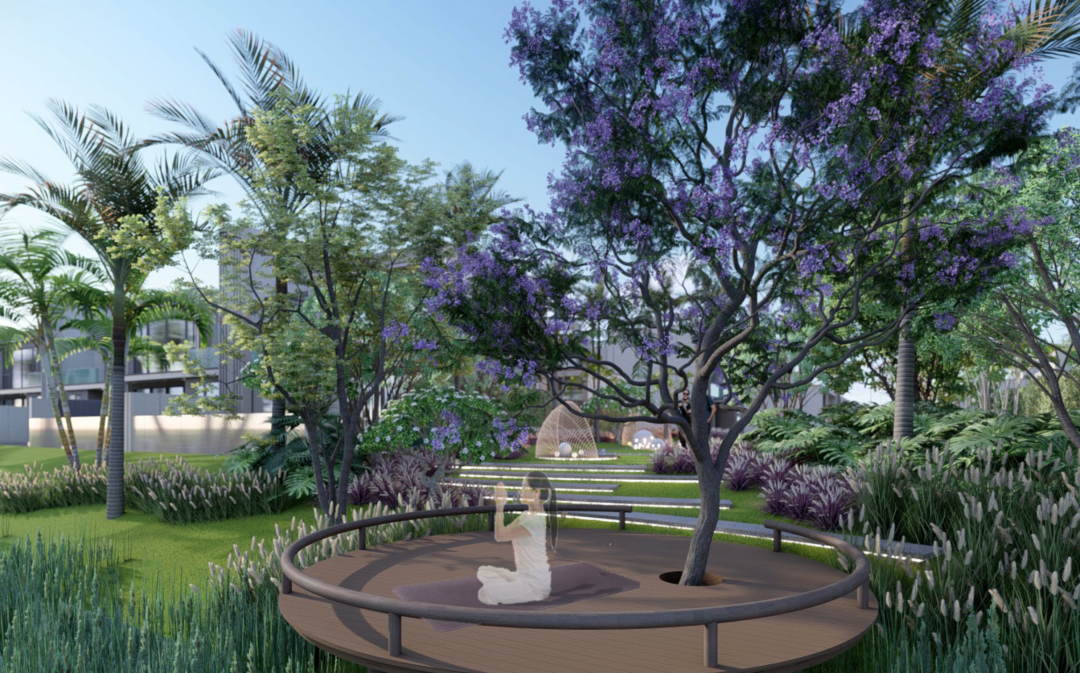 高大的蓝花楹,搭配布置着挂满紫藤的廊架,共同营造出安定、沉静的空间氛围。当业主需要在社区找到一处独享的安静空间阅读或是思考,这里便可以完美满足。