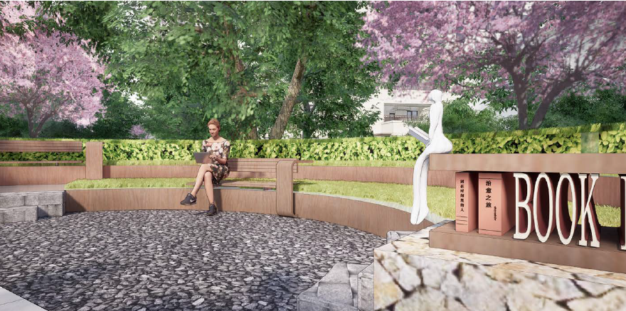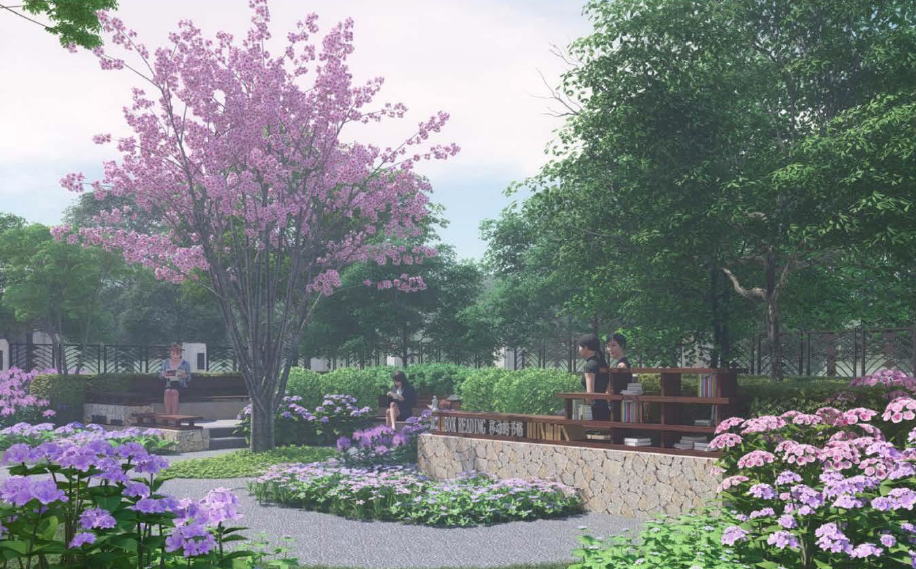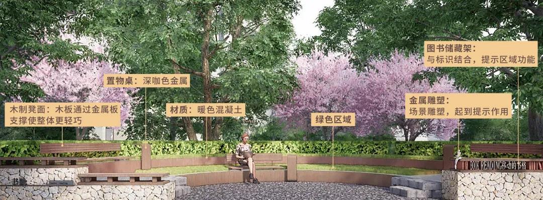 景观结合芳香类点景乔木,底层搭配芳香植物成片栽培,营造出雅致、休息的阅读氛围。组团绿化提升其阅读私密性,让个人空间与公共空间有效共存,互不打扰。