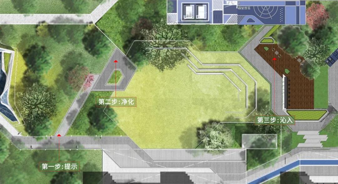 第二步:净化。行至曲路小径,在自然温暖的铺装以及芳香植物所创造的自然意境中豁然开朗,舒缓紧张的情绪,净化内心的阴霾。