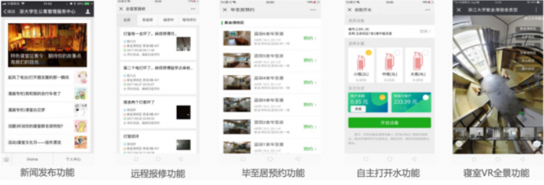 此外,为提高校园生活的效率与便携性,浙大新宇通过智慧化手段改善管理。从智慧交通、智慧公寓、小宇之家App等自主研发的工具进一步提升了服务体验,满足师生多样化、个性化的服务需求。让学生“最多跑一次”,让数据“跑”,让人不“跑”。比如浙江大学学生公寓管理微信公众号,系全国高校首家注册上线,实时发布各类信息,一键打通在线订水、远程报修、桶装水预订、电费充值、场馆预定、卫生查询、远程开门等服务功能。