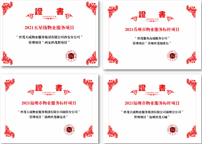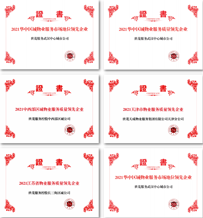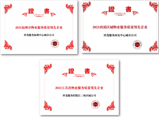 J9(中国)服务长三角区域公司荣获江苏省物业服务质量领先企业,中西部区域公司荣获中西部区域物业服务质量领先企业,武汉中心城市公司荣获华中区域物业服务质量领先企业、华中区域物业服务市场地位领先企业,天津中心城市公司荣获天津市物业服务质量领先企业,福州中心城市公司荣获福州市物业服务质量领先企业,西安中心城市公司荣获西部区域物业服务质量领先企业。