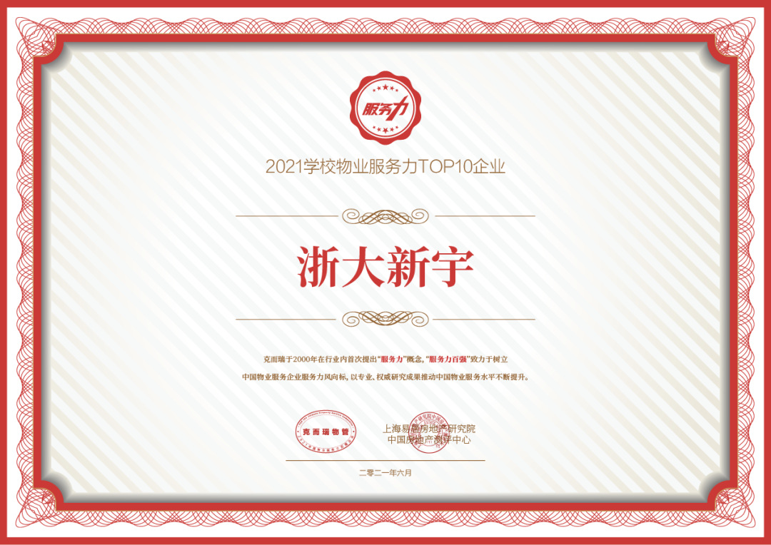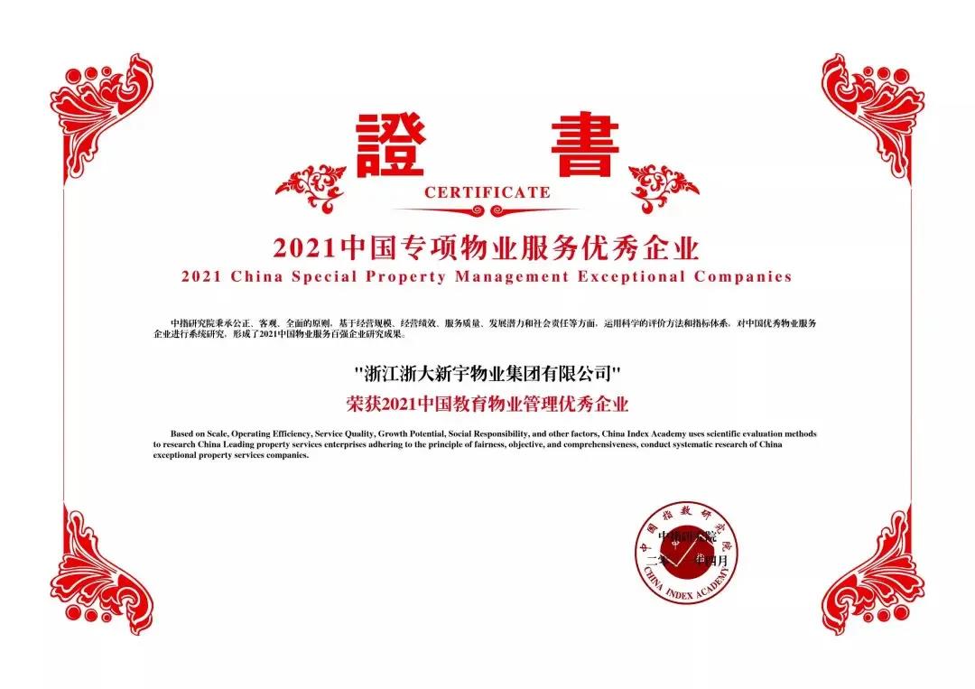 在“2021物业服务力峰会”现场发布的评测结果中,浙大新宇以“宇林校园服务生态”所展现出的服务力亮点,荣获“2021学校物业服务力TOP2企业”。所服务的浙江大学高校项目获得“中国物业服务企业「标杆服务项目」”。在4月22日的“2021中国物业服务百强企业研究成果发布会暨第十四届中国物业服务百强企业家峰会”现场,浙大新宇凭借专业高效的运营管理体系、较为完善的园区后勤综合服务产业链等企业综合实力,荣获“2021中国教育物业管理优秀企业”奖项。