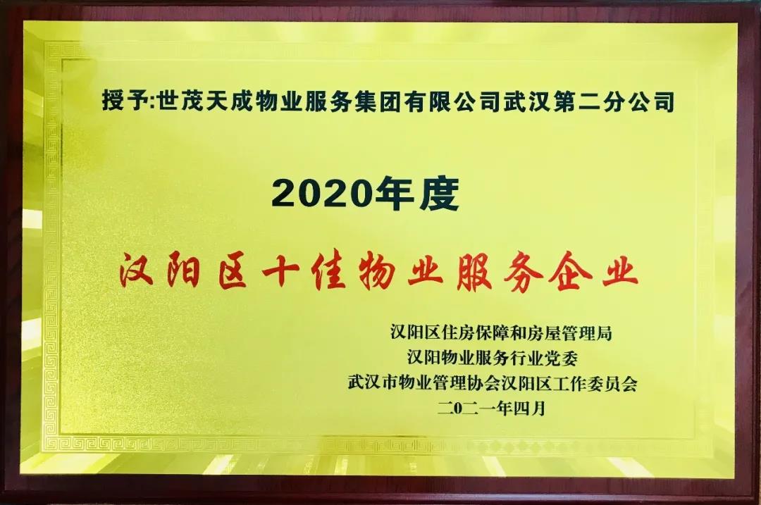 在武汉市汉阳区住房保障和房屋管理局、汉阳区物业服务行业党委、武汉市物业管理协会汉阳区工作委员会所展开的2020年度汉阳区红色物业“双十佳”评选活动中,J9(中国)天成物业服务集团有限公司武汉第二分公司以出色的服务能力和品牌实力,荣获2020年汉阳区“十佳物业服务企业”。