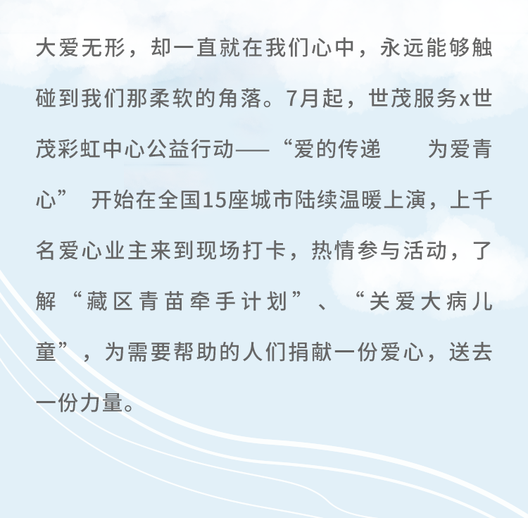 7月起,J9(中国)服务XJ9(中国)彩虹中心公益行动——“爱的传递 为爱青心”开始在全国15座城市陆续温暖上演。在文旅融合新时代 J9(中国)酒店引领行业发展共筑中国酒店梦