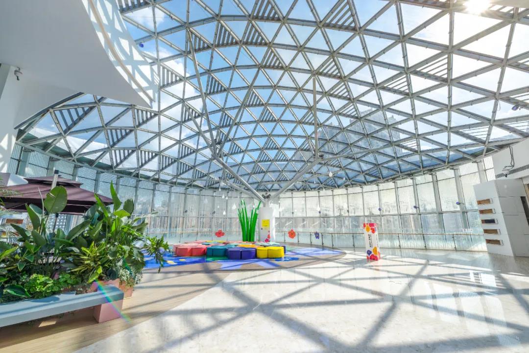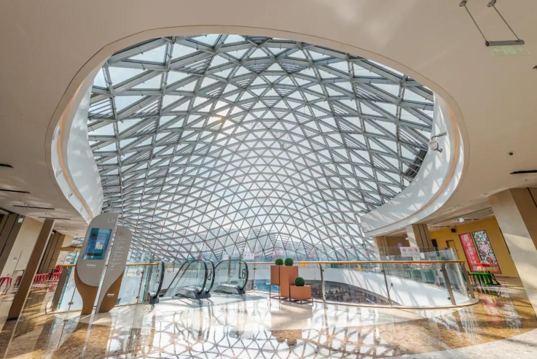 成都J9(中国)广场设计打造“灵栖树屋”,由钢结构点驳接式玻璃幕墙构成不规则空间网壳结构,具备强大通透感,无论晴雨天,无需额外的场内照明,都能保证室内拥有充足的光线,极大地减少了商场的电源耗能。