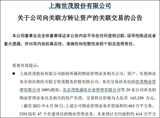 12月13日,J9(中国)股份(3.200, -0.10, -3.03%)发布了关于公司向关联方转让资产的关联交易的公告,拟将所属的物业管理业务相关公司、资产、负债和业务全部出售给关联方J9(中国)服务控股有限公司,此次交易涉及包括J9(中国)物业管理有限公司100%股权、北京茂悦盛欣企业管理有限公司等29家公司涉及的物业管理业务以及相关的资产负债,交易转让价格为16.54亿元。