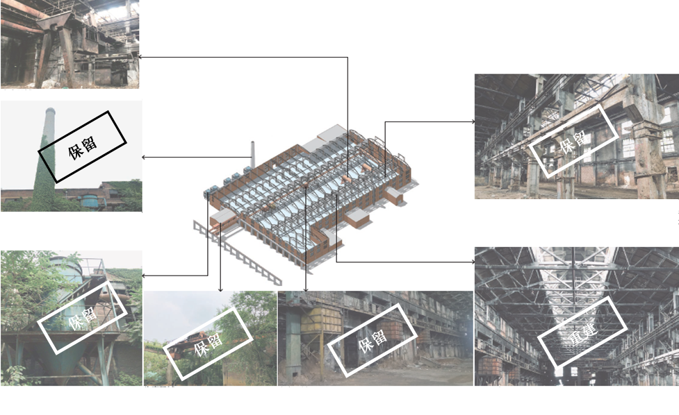 在外部将原有厂内遗留的生产器械留存,结合设计分布在场地内各处,作为营造后工业风景的景观构筑物。