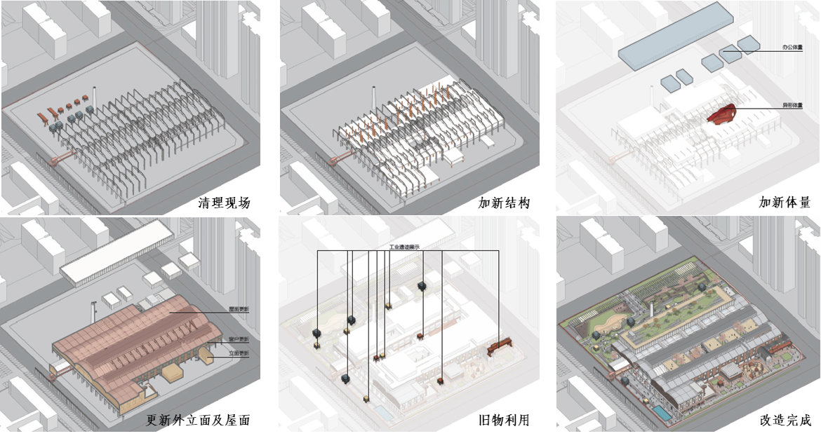 在内部空间的处理上,为了更好地展现厂房原有梁柱及屋架结构,我们将两跨结构连接处作为新增商业功能的中庭空间,同时向两侧逐层退台,以此获得丰富的内部空间,同时,也为将来人们创造了从不同高度和不同视角观察、体验工业遗存的机会。