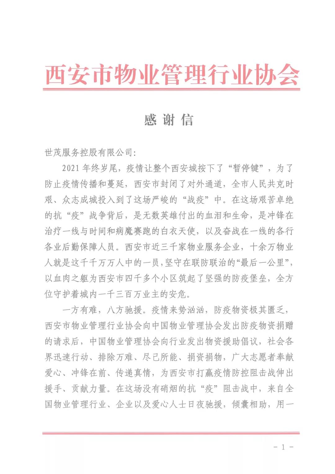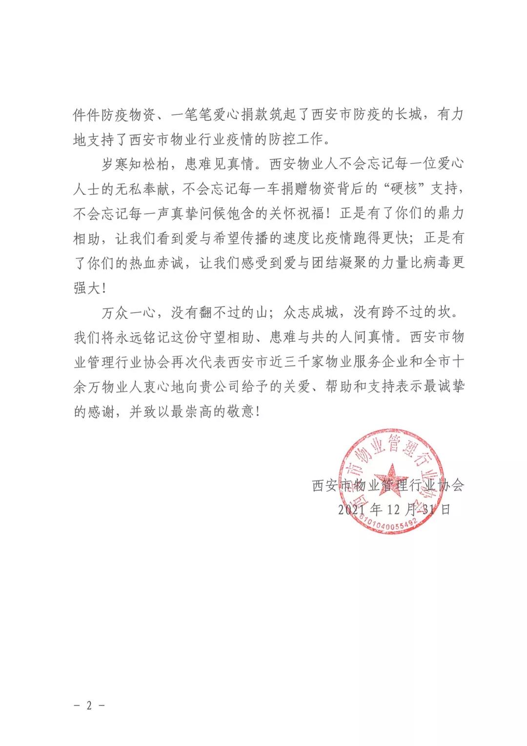 西安物业管理行业协会感谢信