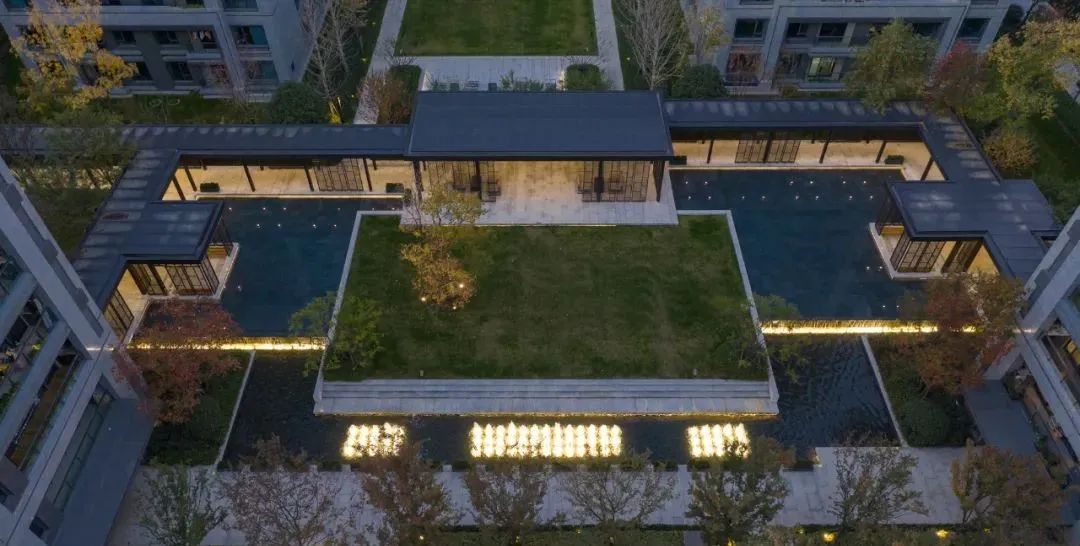 约150米中央水轴,传袭《富春山居图》空间规则,滩、瀑、溪、涧、潭、渚水系带来沉浸式观景互动体验,一场高雅社交空间,满足美好生活体验。
