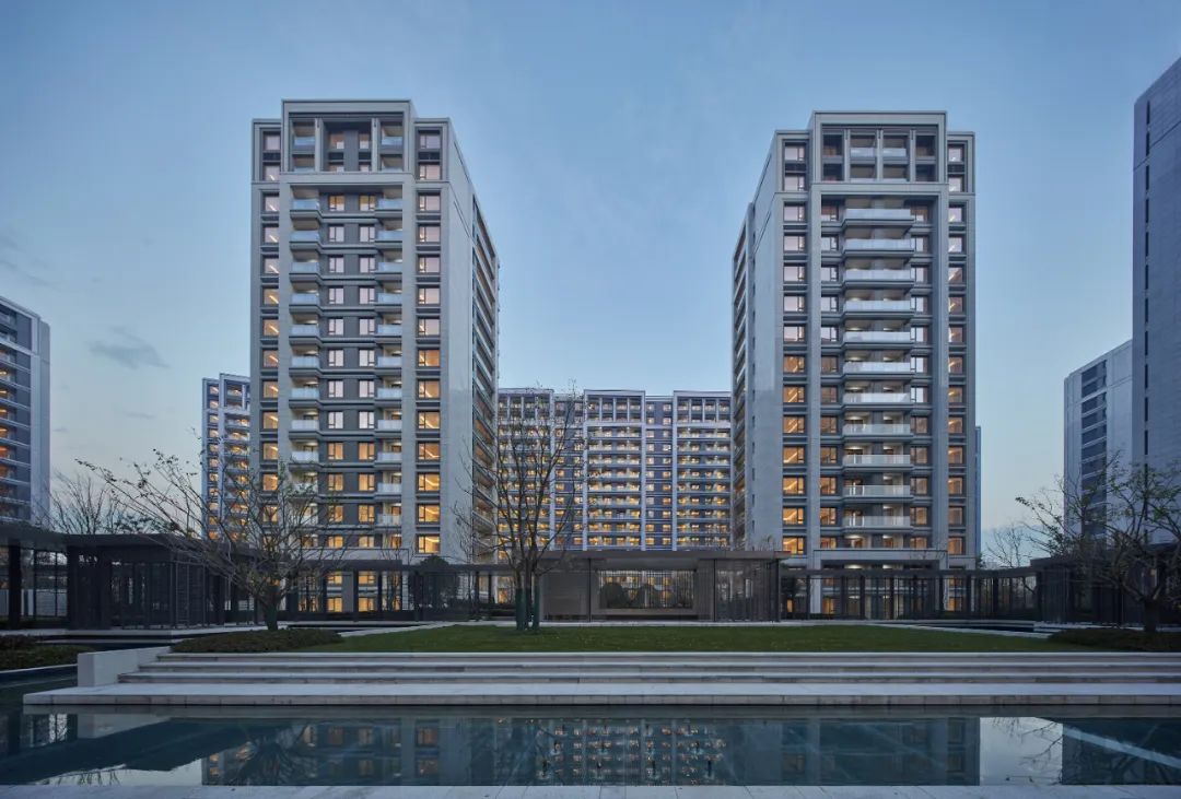 洋房入户立面选定亮面山东白麻石材+浅灰、深灰色氟碳喷涂铝板干挂幕墙体系,其中亮面石材营造出镜面效果,还原了建筑浑然天成,似玉非玉的天然美感。