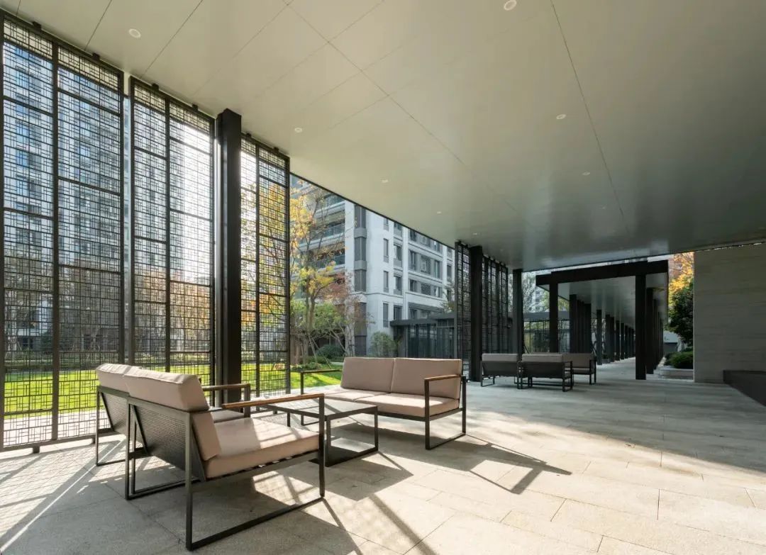 侧旁风雨连廊遵循观赏性与社交性造景格局,以水为引,光影微澜,闲来信步,“出则繁华,入则宁静”的生活志趣于此展现,谈笑间,尽是惬意。