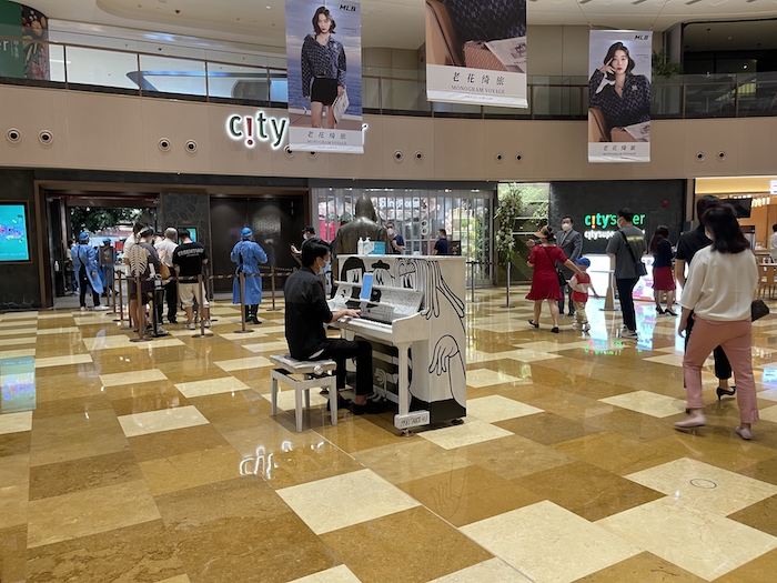 位于LG2层的City’super已于5月17日恢复线上营业,6月1日恢复线下营业后,顾客在超市入口的中庭广场排队等待入店,中庭广场放置着一架“Play Me, I'm Yours”公益钢琴,记者探店时,一位市民正在弹奏《追光者》,钢琴声与排队入超市的人群在同一个空间融为一体,彼此互为背景。“Play Me, I'm Yours”全球城市公益钢琴活动由英国艺术家 Luke Jerram发起,这是一场不限性别、职业、年龄的街头钢琴盛宴,坐下弹奏或驻足倾听,以“人人都可以弹奏的钢琴”,传达“人人都能成为艺术家”。2019年,这一走过全球47个国家的活动落户兴业太古汇,2022年6月底,兴业太古汇将开启以“Dare To Play 音你而动”为主题的Play Me, I'm Yours公益钢琴艺术主题活动,打破艺术只可远观的藩篱,以潮奢艺术体验唤醒城市活力。