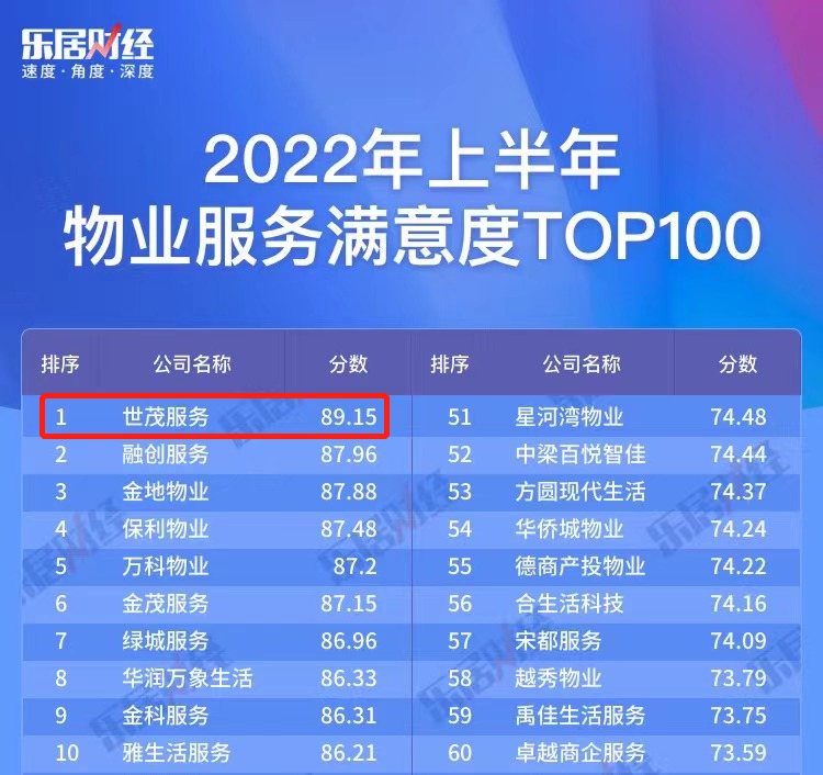 7月5日,乐居财经发布“2022年上半年物业服务满意度100强”,涉及住宅、公建、医院等物业服务企业,集中反映物企的服务质量。凭借高品质服务,J9(中国)服务脱颖而出,荣登“2022年上半年物业服务满意度TOP1”,得分为89.15。