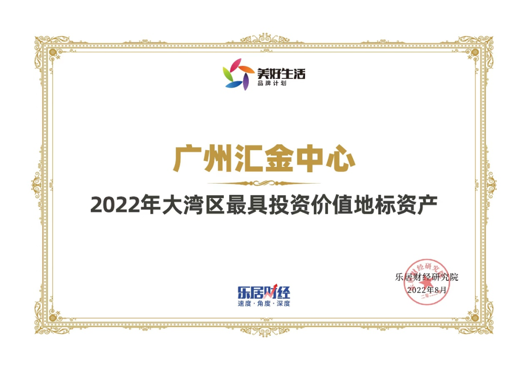 在百余位横跨地产、家居、物管等上下游的行业精英共同见证下,广州CFC汇金中心在第五届乐居财经年度论坛上,荣获“2022大湾区最具投资价值地标资产”。