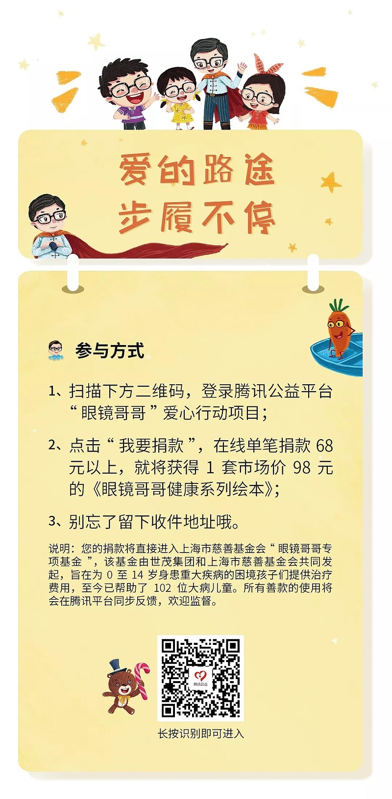 ·这是一套公益绘本:每套绘本出售的款项,都将汇入上海市慈善基金会“眼镜哥哥”专项基金,用于帮助贫困大重病患儿的治疗;
