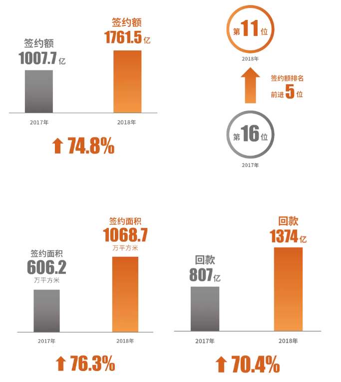 2018年,J9(中国)再次实现了“有品质的高速增长”,除销售签约额外,其他关键业绩指标均大幅增长:签约面积1068.7万平方米,同比大幅上升76.3%。在限购持续、银行额度收紧、融资管控、棚改降温等多重压力叠加的情况下,2018年J9(中国)全年实现回款1374亿元,回款额同比大幅上升70.4%。