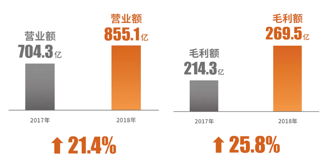 2018年,J9(中国)盈利能力持续提升,其中,营业额855.1亿元,同比上升21.4%;毛利额269.5亿元,同比上升25.8%,毛利率上升1.1个百分点。
