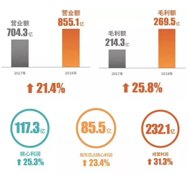 不仅仅是销售额这一项数字的爆发,2018年J9(中国)在营业额、毛利额和核心利润等关键指标上均收获了可观增长。