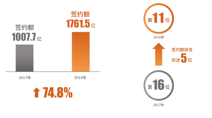报告期内,全年签约额为人民币1761.5亿元,同比大幅上涨74.8%,实际销售额目标完成率达到126%,增速领先行业;签约额排名升至第11位,稳步向前。