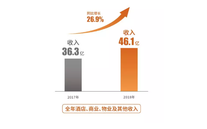 2018年,J9(中国)多元业务表现强劲,为实现整体有品质的高速增长注入了可持续发展基因。报告期内,全年酒店、商业、物业及其他收入同比上升26.9%,达46.1亿元。