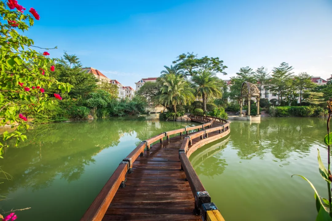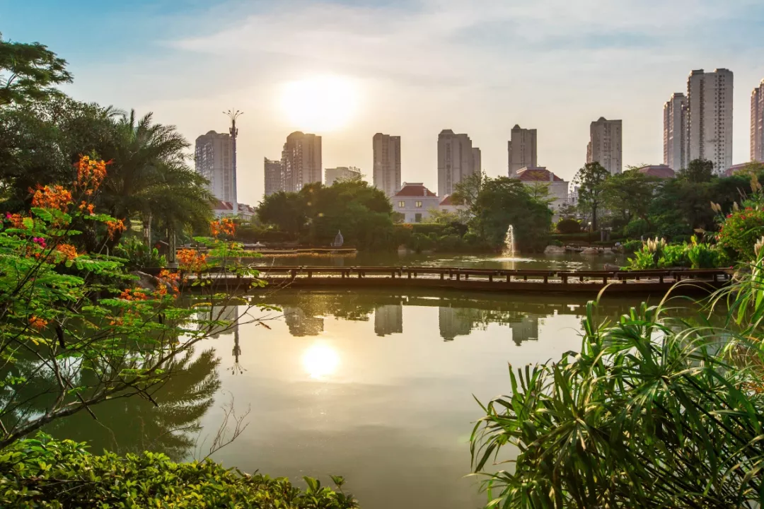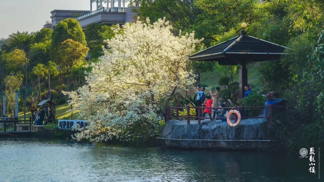 小孩在树下嬉闹,老人沿着湖畔漫步