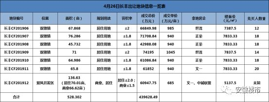 文一以940万元/亩竞得双墩镇长丰CF201911号地块,总价61852万元,住宅楼面价7833.33元/㎡,溢价率88%;