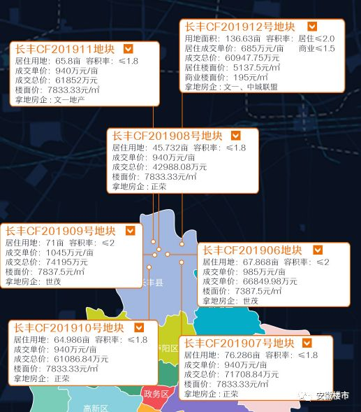 从地块位置来看,除了长丰CF201912地块位于双凤开发区之外,其余6宗地块均位于双墩镇,且位置及其接近。