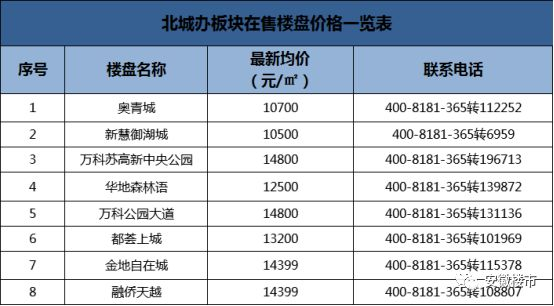据了解,北城办板块目前在售楼盘,价格区间在1.0-1.5万/㎡之间,万科公园大道和万科苏高新中央公园是北城办板块楼市价格天花板,最高卖到了1.48万/㎡。