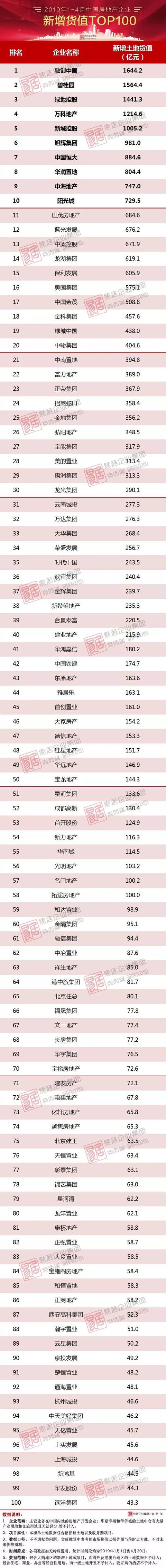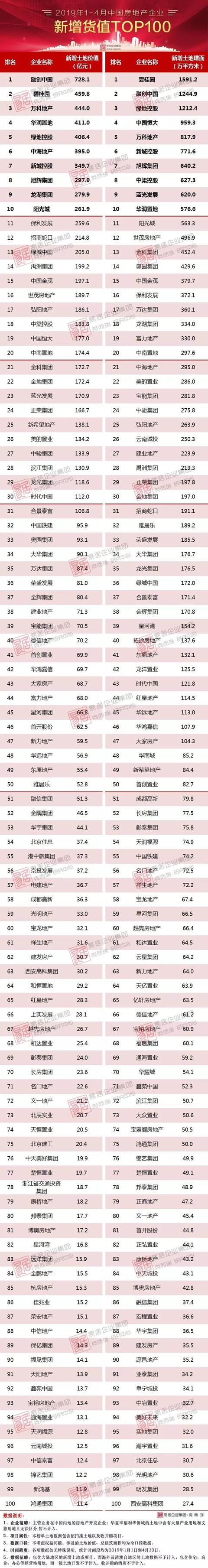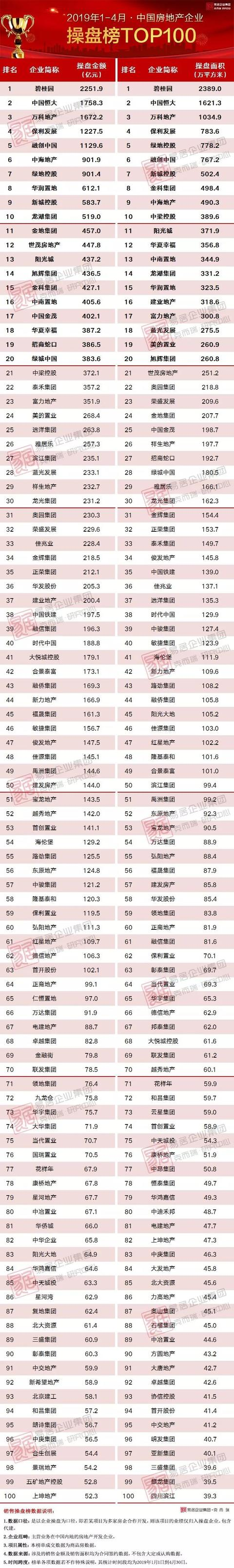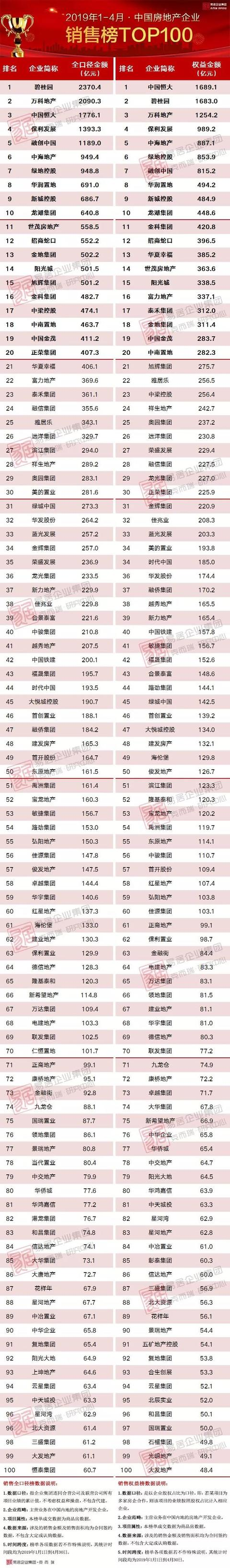 2019年1-4月中国房地产企业销售、新增货TOP100排行榜出炉!2019年1-4月中国房地产企业销售、新增货TOP100排行榜出炉!